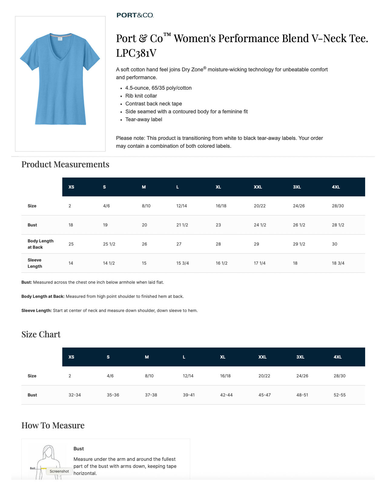 Port & Co. Performance Blend V-Neck Tee4.5 oz., 65% polyester, 35% cotton.